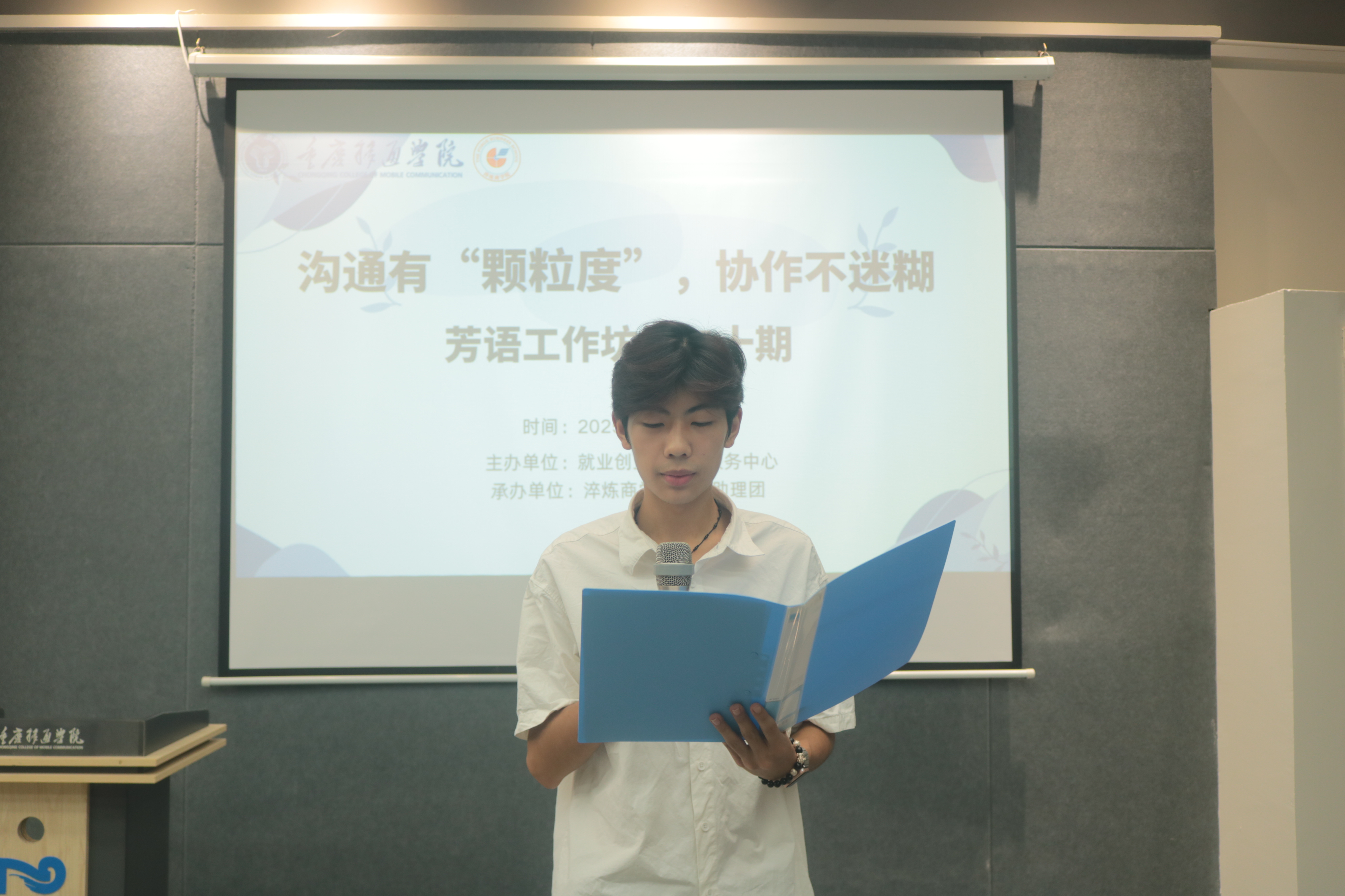 公开表达,不仅是职场沟通的核心桥梁,更是个人竞争力更直观的实力名片。为帮助同学们突破表达障碍、提升自身的表达能力。由重庆移通学院就业创业指导与服务中心主办、淬炼商学院承办的“芳语工作坊第二十期——沟通有‘颗粒度’,协作不迷糊”于2025年10月10日15点在南湖书院声影活动室顺利开展。本次讲座有幸邀请到淬炼商学院芳语工作坊指导老师邓巧,为同学们分享实用的公开表达技巧,帮助同学们锻造职场沟通的核心表达能力。
