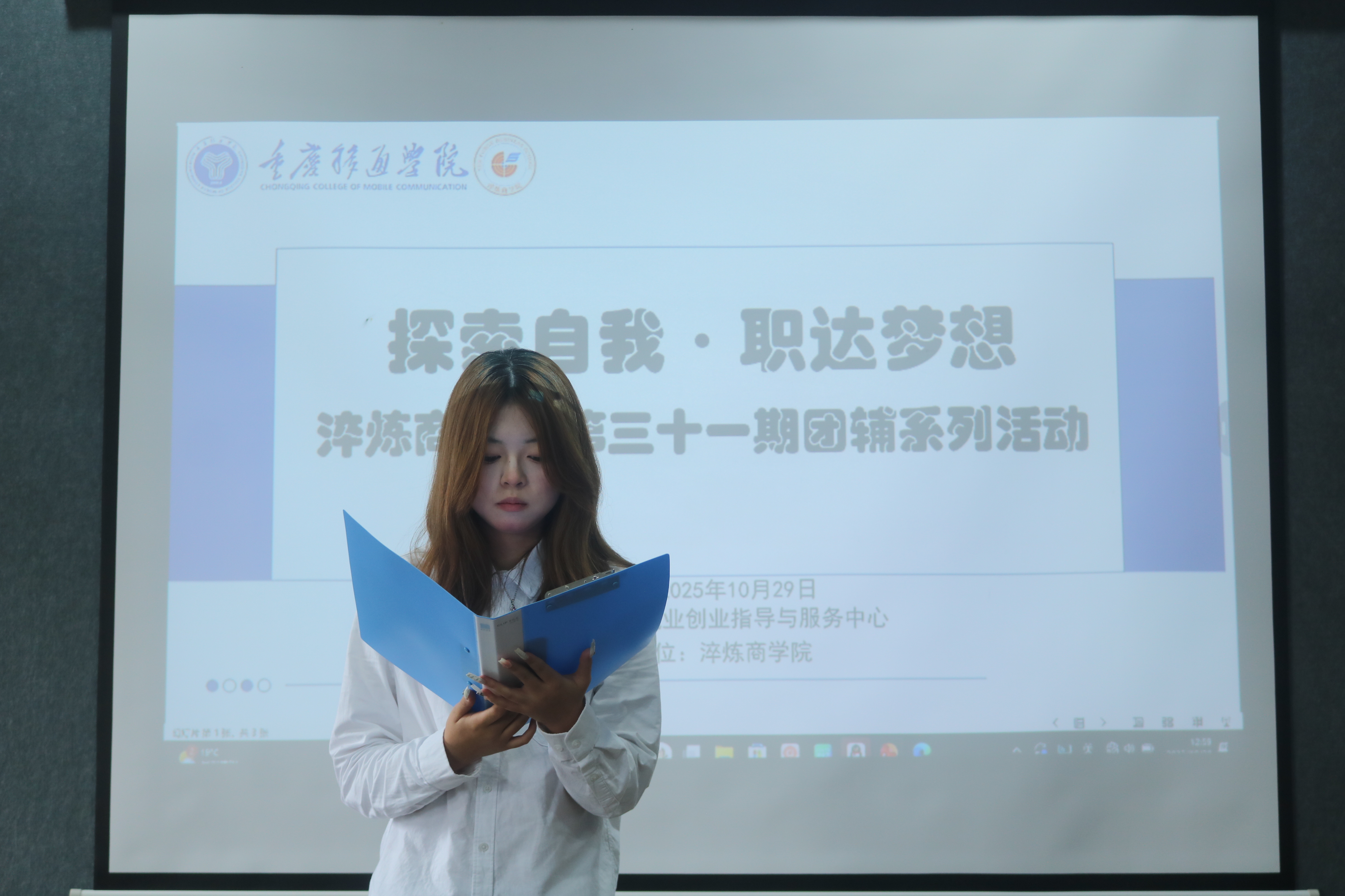 职业生涯规划恰似一座灯塔,指引着同学们探索职业的航向。为帮助同学们清晰自我定位、夯实逐梦根基。由就业创业指导与服务中心主办、淬炼商学院承办的“探索自我·职达梦想——淬炼商学院第三十一期团辅系列活动”于2025年10月30日在汇江书院影音活动室顺利开展。本次活动特别邀请到重庆移通学院就业创业中心职业指导科副科长、全球职业生涯规划师伍早金担任主讲人,为同学们带来自我探索与职业规划的实用指导。