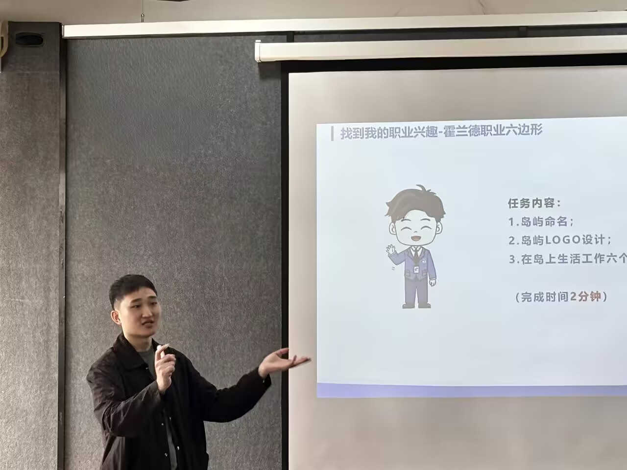 通过自我特质找到兴趣来适配职业是减少职业迷茫的重要基础。伍早金老师聚焦兴趣与职业对应关系,组织同学们根据霍兰德职业六边形选取六座岛屿之一来设计自己的三条计划,通过互动找到兴趣与职业的契合点,让同学们理解适配需结合自我兴趣与外部参考。同时,伍早金老师建议以测评为起点,结合六条特质要求梳理未来职业目标,通过行业调研深化适配认知,进而突破职业选择模糊地带,减少同学们的职业选择迷茫。让同学们了解职业选择不是一个被动等待机会的过程,而是一个需要主动研究、主动匹配、主动决策的自我管理项目。
