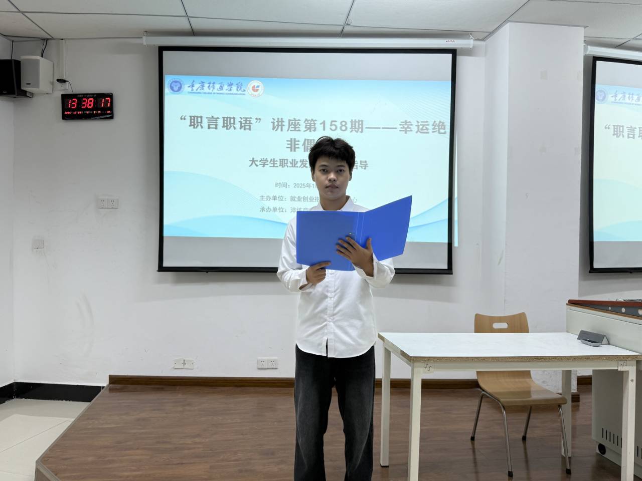 为帮助大学生明确职业发展方向,提升就业竞争力,纠正“就业全靠运气”的认知偏差。2025年10月29日14:00,由就业创业指导与服务中心主办、淬炼商学院承办的“职言职语”第158期讲座——“幸运绝非偶然·大学生职业发展与就业指导”在天空书院205教室顺利举行。本次活动特邀重庆邮电大学安法学院党委书记刘景刚担任主讲嘉宾,为在场学生带来了一场内容丰富、见解深刻的就业指导讲座。