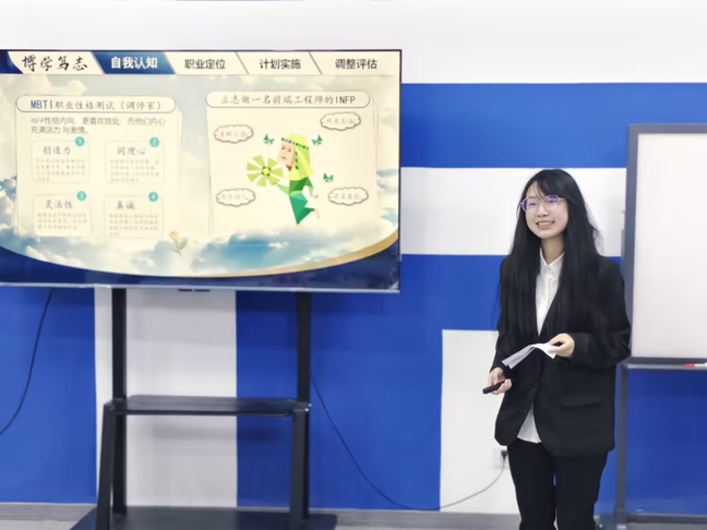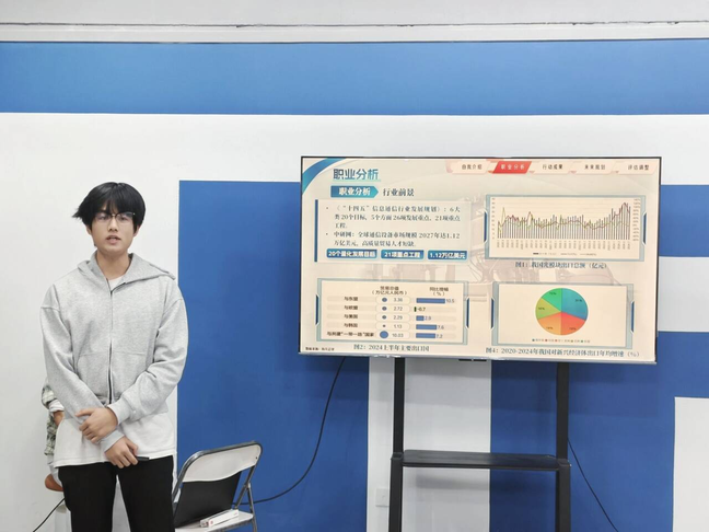 比赛现场气氛热烈,选手们通过精美的PPT和精彩的演讲,分析自身优势,阐述职业目标和发展路径,用多元形式诠释职业梦想,呈现出有深度、有个性的职业规划方案。赛场上,有的同学以“制造强国”使命感为核,融合专业与组织能力,聚焦工业互联网岗位,尽显工科青年“技术为基、服务为国”的思考与决心,还有的同学以AI领域深耕热忱为核,融合算法积淀与创新思维,聚焦人工智能算法岗位,尽显技术青年“深耕算法、赋能产业”的追求与担当。