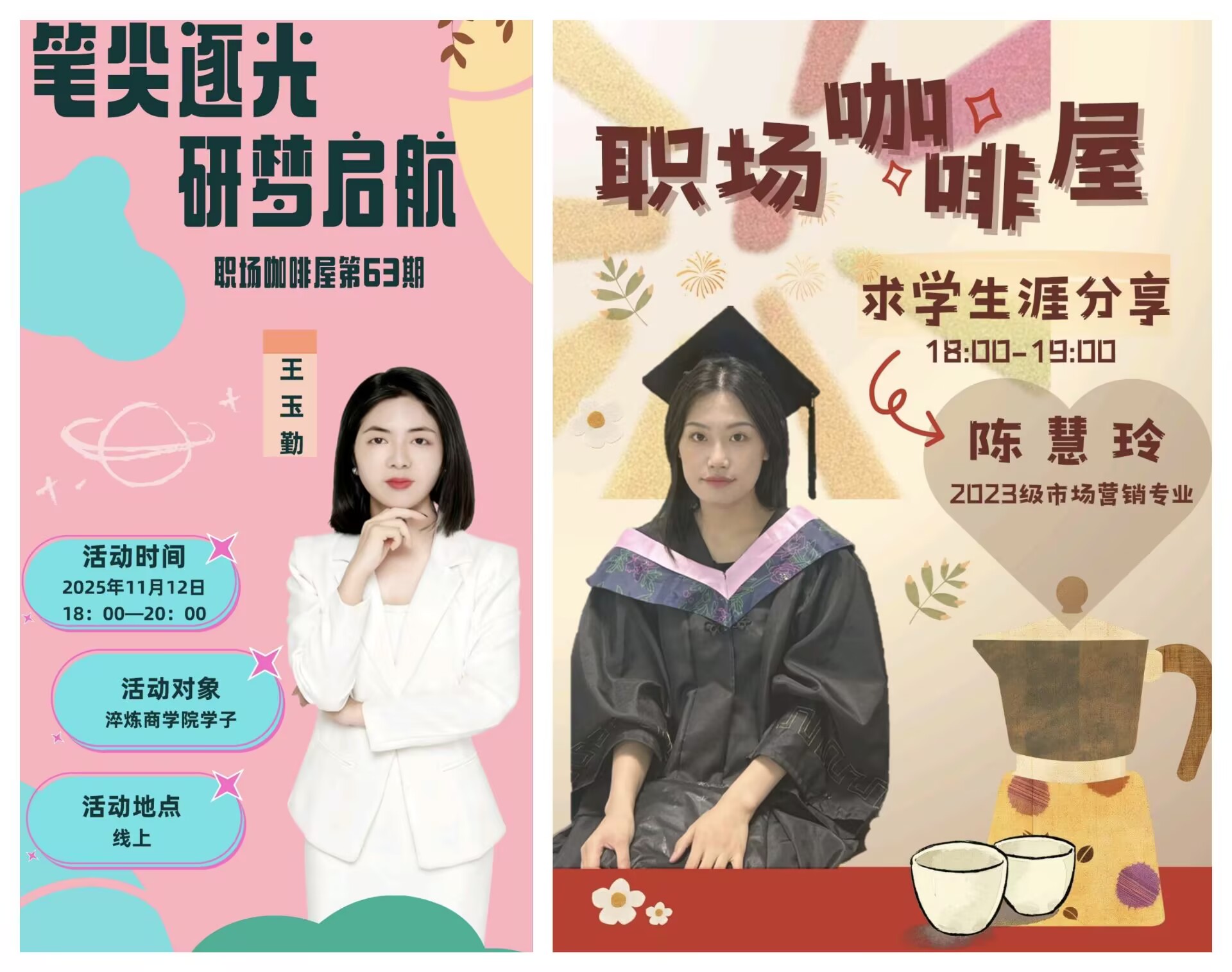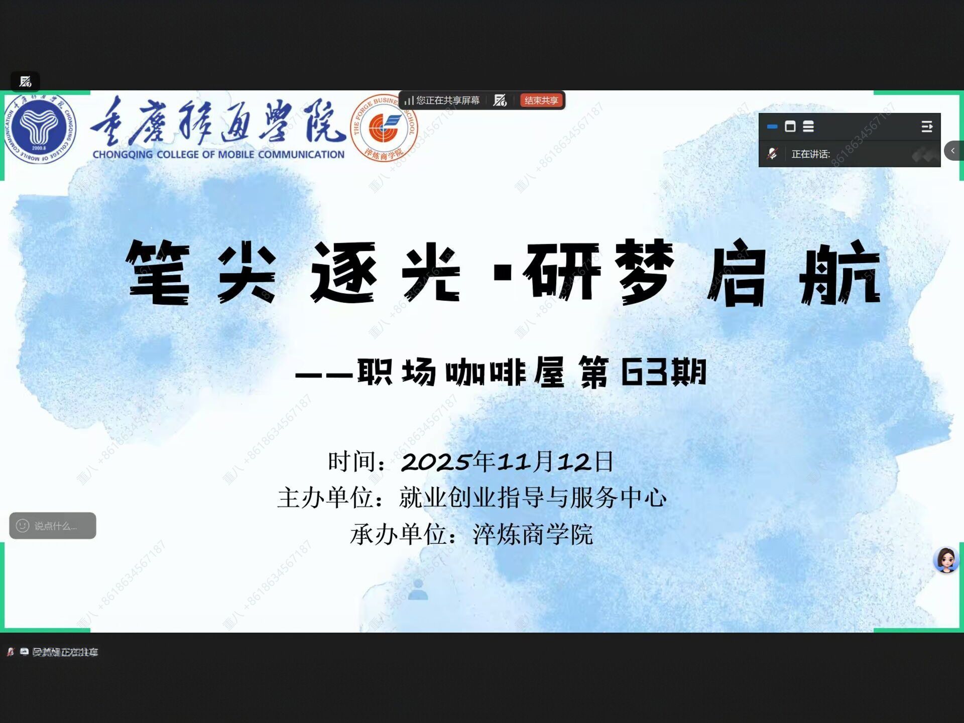 为帮助同学们明晰考研方向、破解备考困惑,搭建优质的经验交流平台。由重庆移通学院就业创业指导与服务中心主办,淬炼商学院承办的“笔尖逐光·研梦启航”——职场咖啡屋第63期于2025年11月12日下午18:00在腾讯会议顺利开展。本次分享会特邀成功考研上岸的学姐陈惠玲、创新创业导师王玉勤,为同学们带来一场干货满满的考研“实战指南”。
