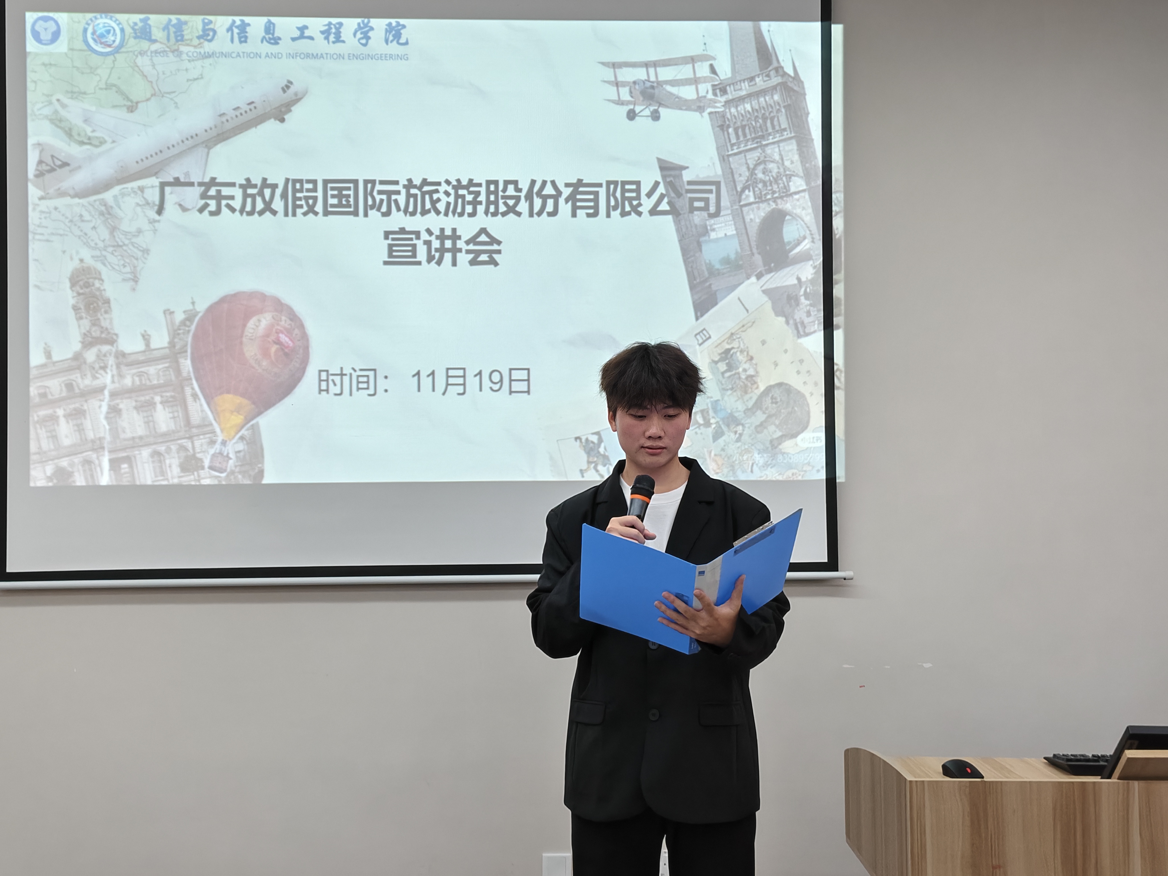 2025年11月19日,由重庆移通学院就业创业服务与指导中心主办、通信与信息工程学院承办的“携手放假国旅,共筑通信未来”招聘宣讲会在南湖智慧教室成功举办。本次宣讲会吸引了全校各专业30余名对互联网科技与数字文旅融合方向感兴趣的同学踊跃参与。