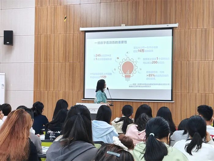 活动开始之际,马莉老师总体地先向同学们概括目前关于简历方面的知识,随后分层次从用人单位、招聘信息、简历的制作以及对ai简历的应对技巧等四个方面,深入浅出的为同学们讲解相关理论知识和个人经验。作为学校就业创业导师库导师,马莉老师为即将步入职场的学子们提供了丰富的简历制作经验,并深入剖析当前简历制作的发展趋势和用人单位的筛选特点,全方位的为同学们讲解现今社会用人单位会“选择”什么样的简历。