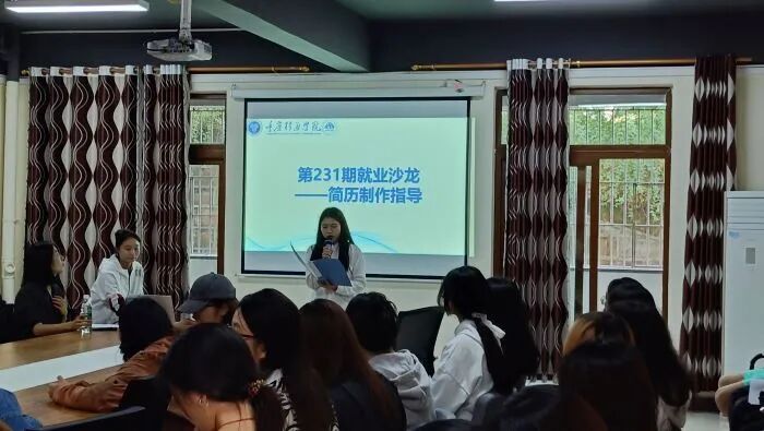 在当今竞争激烈的职场环境中,简历作为求职者的敲门砖,其重要性不言而喻。一份精心制作的简历不仅能够迅速吸引招聘者的眼球,还能有效展现求职者的专业素养、工作能力及个人品质,从而大大增加获得面试机会的可能性。为了帮助制作一份良好的简历,由就业创业指导与服务中心主办,外国语学院承办的就业沙龙第231期——“精准定位,简历制胜”于2024年10月9日在荷悦112会议室开展,本次活动有幸邀请到淬炼商学院辅导员、就业创业导师库导师王玉勤老师,为在场72名同学讲解简历制作的小tips。