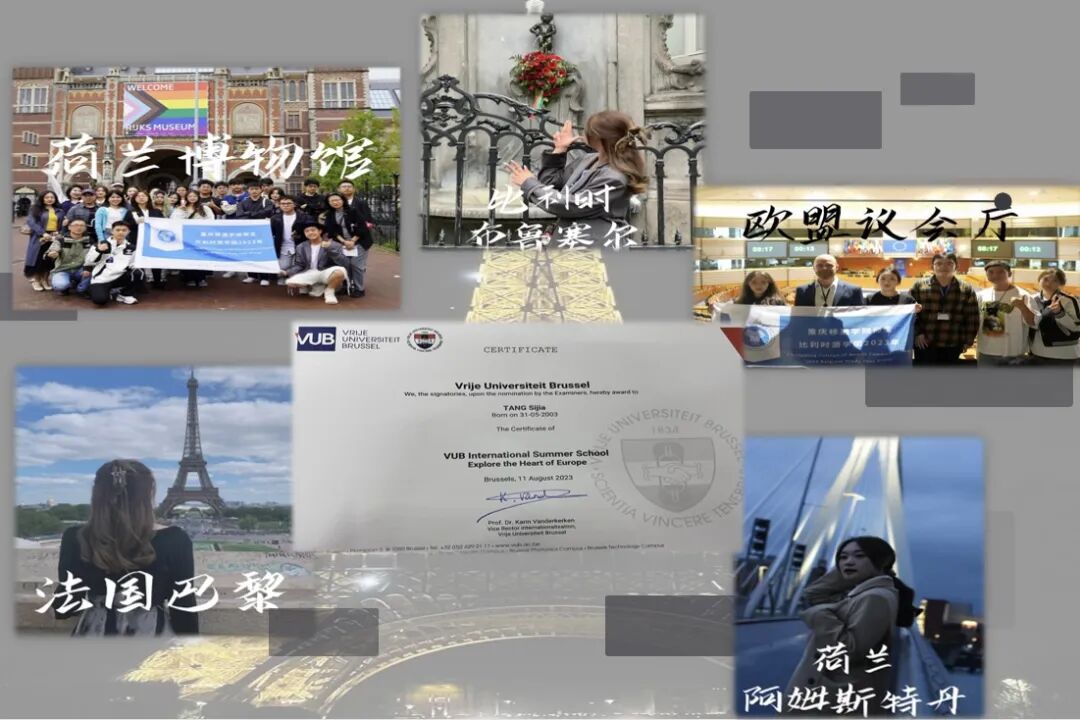 大二那年学校推出了国际交流项目,第一时间我就去大胆报名,经过三轮严格选拔最后成功的走出校园在2023年暑期跨越10680公里赴比利时的布鲁塞尔自由大学交流学习,把自己的足迹也留在比利时、荷兰、法国巴黎等地,在咫尺的坚持中享受到了这个多彩的世界,也为自己的简历多添一份光彩。