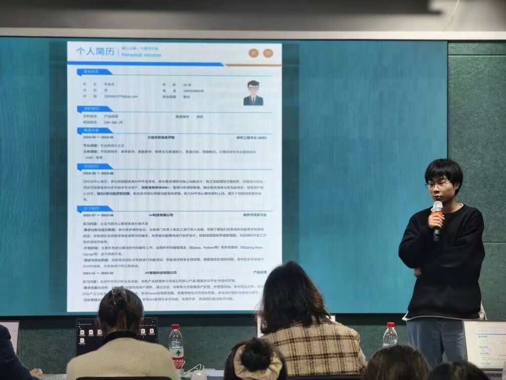 决赛现场氛围热烈而庄重,赛事环节紧凑有序。核心的陈述环节中,每位选手需在5分钟限时内,结合分配的求职人物背景与岗位需求,精准展现简历的核心亮点与设计巧思,现场计时器实时把控节奏,充分考验着选手们的逻辑梳理与时间管理能力。参赛选手用数据图表直观呈现“求职人物”的项目成果,将复杂的专业经历拆解为清晰的能力模块;从容的神情赢得现场阵阵掌声;创新性思维采用“问题-解决方案-成果”的逻辑框架,将求职人物的实习经历串联成完整的能力叙事,语言精炼且重点突出,充分展现了清晰的逻辑思维。